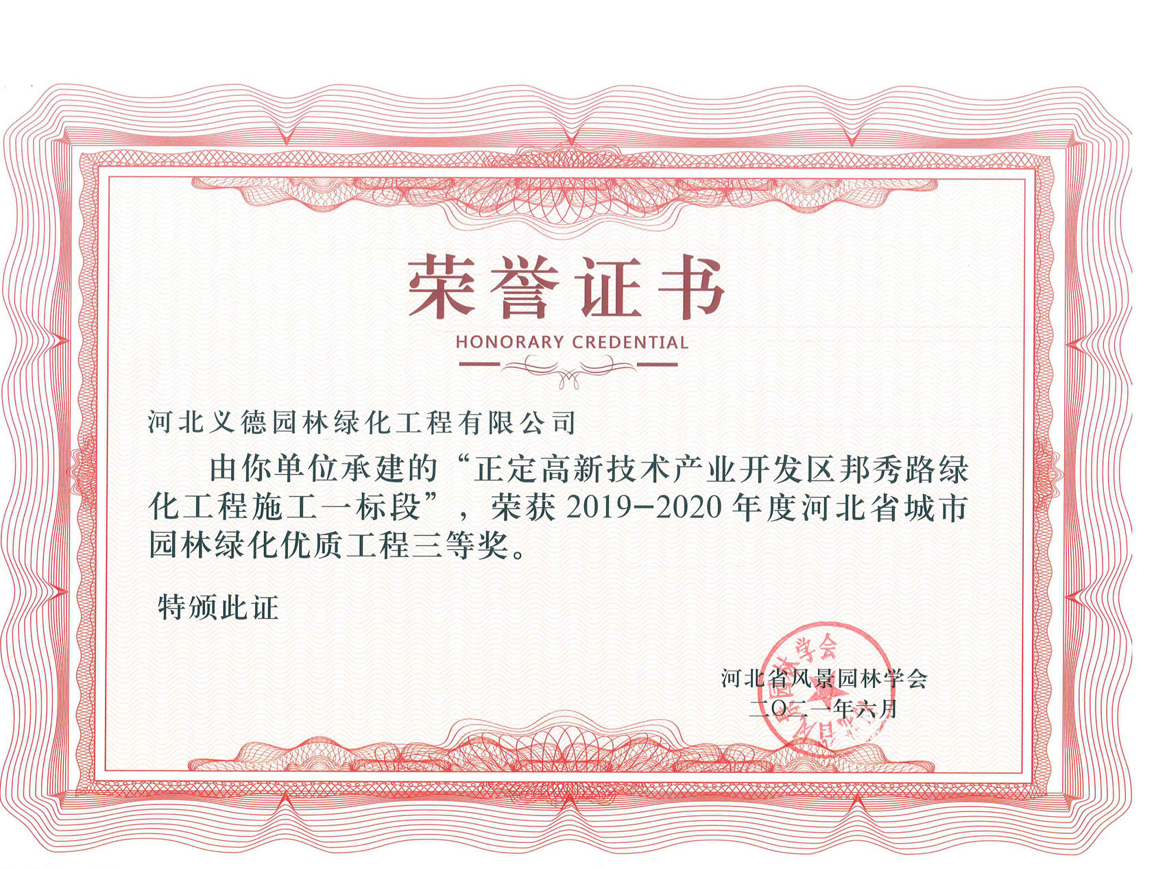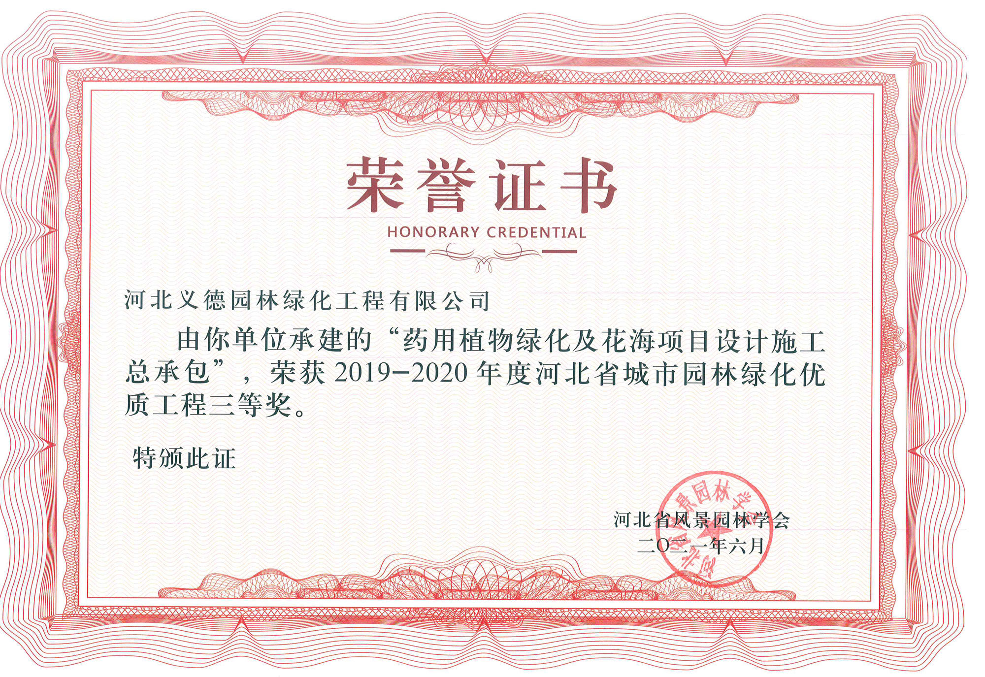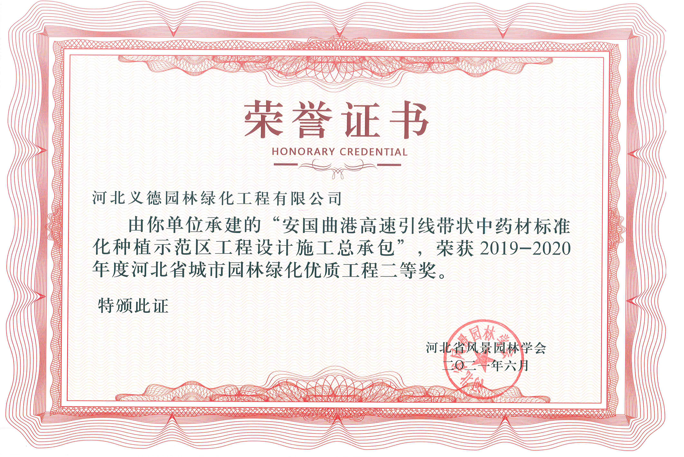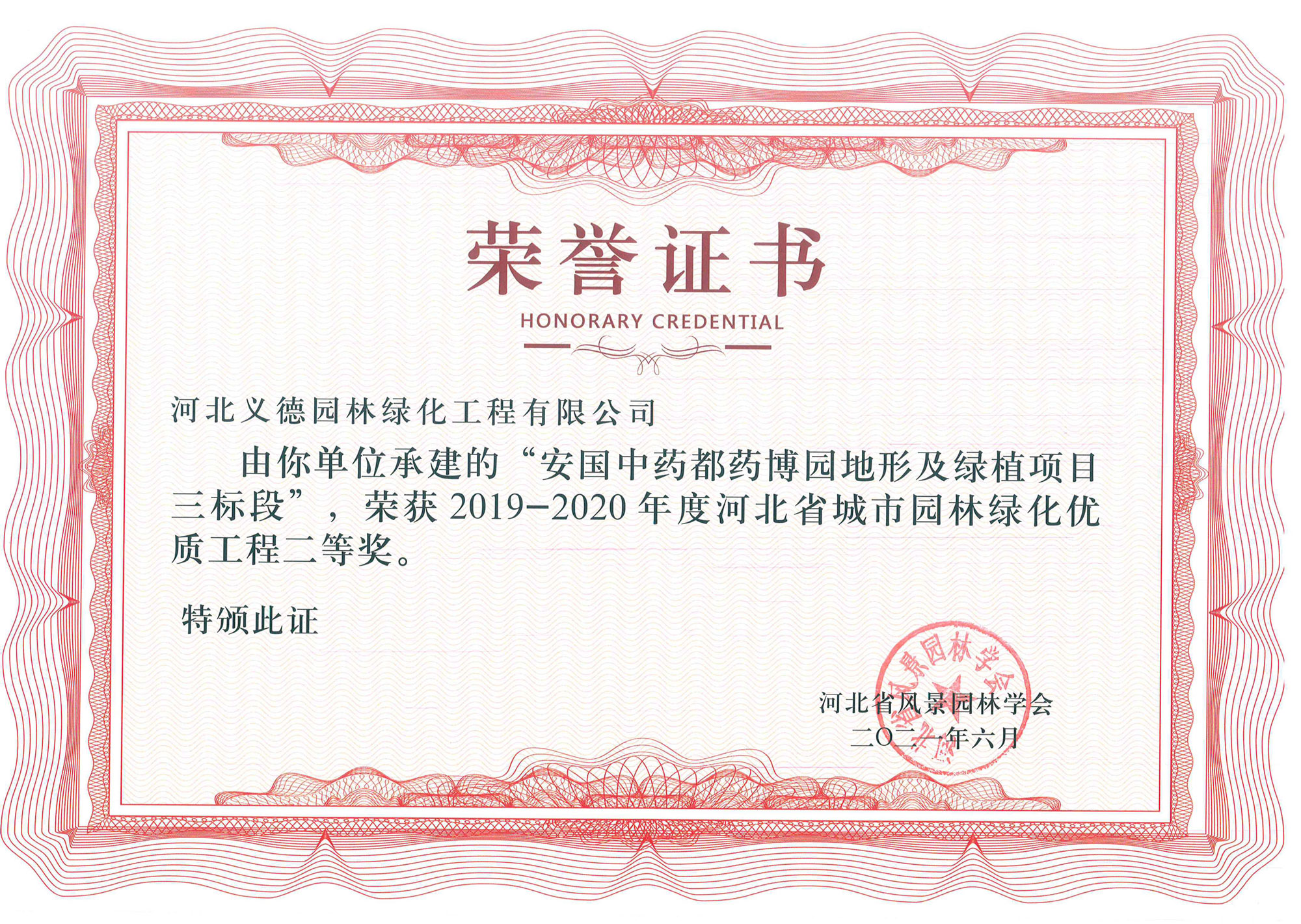 工程業(yè)績(jī)榮獲有2017-2018年度河北省城市園林綠化優(yōu)質(zhì)工程二等獎(jiǎng)兩個(gè);2019-2020年度河北省城市園林綠化優(yōu)質(zhì)工程二等獎(jiǎng)兩個(gè)、三等獎(jiǎng)兩個(gè);2018至2020年保定市燕趙杯優(yōu)質(zhì)工程五個(gè);2020年度石家莊市優(yōu)質(zhì)工程一個(gè)。