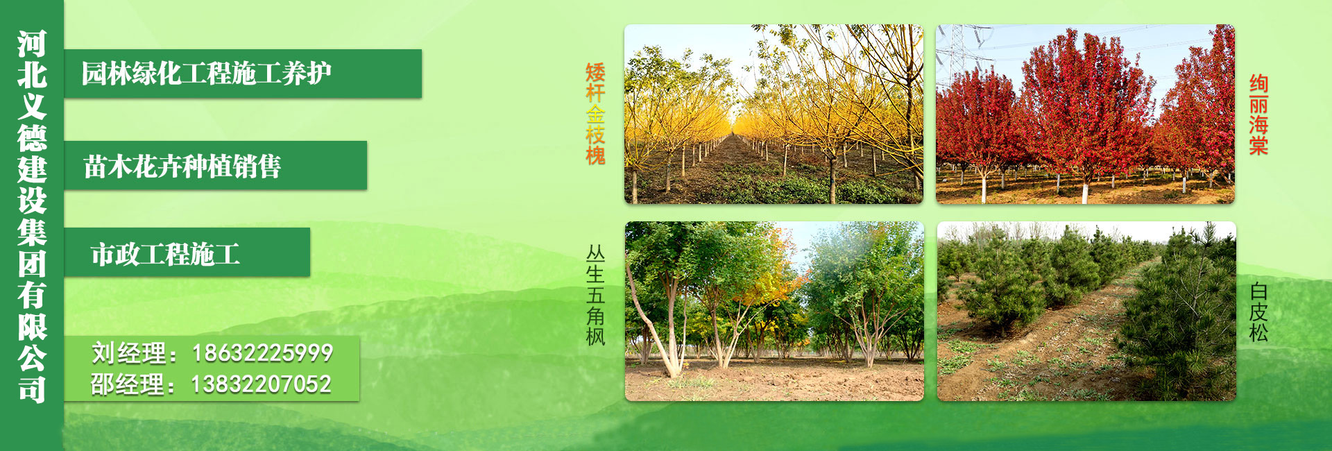 在“信譽(yù)第一、質(zhì)量第一、服務(wù)第一”的宗旨指導(dǎo)下,積極探索研究園林綠化工程的市場(chǎng)需求狀況與發(fā)展趨勢(shì),我公司業(yè)績(jī)有市政園林綠化、高速公路綠化、國(guó)家儲(chǔ)備林建設(shè)項(xiàng)目房地產(chǎn)綠化項(xiàng)目、園林綠化養(yǎng)護(hù)項(xiàng)目等。近年來(lái)公司先后承接大型市政園林綠化項(xiàng)目:石家莊南二環(huán)東延西延綠化-西延綠化工程一標(biāo)段、正定高新技術(shù)產(chǎn)業(yè)開(kāi)發(fā)區(qū)邦秀路綠化工程施工一標(biāo)段、晉州市鏡湖大街道路綠化工程一標(biāo)段、安國(guó)中藥都藥博園地形及綠植項(xiàng)目三標(biāo)段、安國(guó)曲港高速引線帶狀中藥材標(biāo)準(zhǔn)化種植示范區(qū)工程設(shè)計(jì)施工總承包、藥用植物綠化及花海項(xiàng)目設(shè)計(jì)施工總承包、迎接全省中藥產(chǎn)業(yè)發(fā)展大會(huì)環(huán)境整治工程勘察設(shè)計(jì)施工總承包(EPC) 第三標(biāo)段。